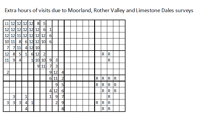 This map shows the number of additional hours spent in each tetrad during the Moorland Birds and Limestone Dales surveys and the tetrads represented during the Rother Valley Survey (in which the number of hours spent is not known)