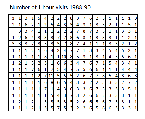 When studying the species maps you might wonder whether the absence of a species (ie not even a tick) is simply due to the limited time spent in each tetrad. The following maps show how many hours of data were available for each tetrad.