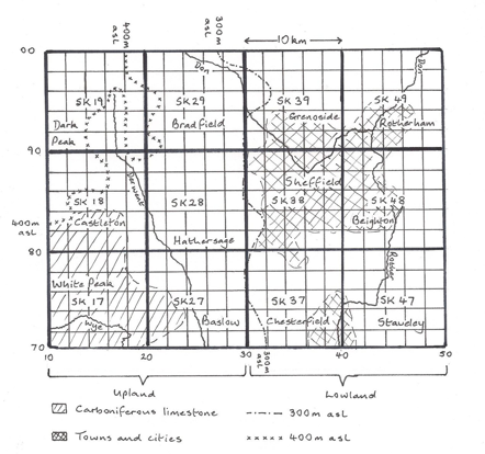 These maps refer to the 300 tetrads in the Sheffield area (as covered by the Sheffield Bird Study Group). Note that the left half of the map is mostly upland (Peak District) and the right half is mostly lowland.