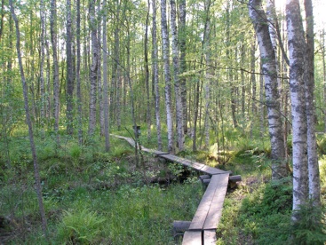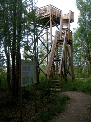 The trail leads to a tower overlooking a delta area where the Hoytiainen Canal meets Lake Phyaselka.