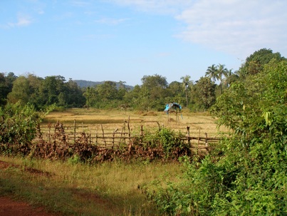 The lane outside the camp leads to open fields with petronias, shrikes and a chance of seeing peafowl and junglefowl