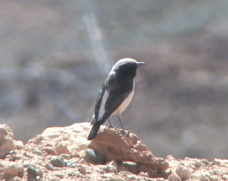 Maghreb Wheatear on ‘Wheatear Wall’, Boumalne, Morocco April 2009. The sullied grey crown (instead of pure white) and grey-black back (instead of jet black) suggest this male had one parent of a different wheatear species, perhaps Seebohm’s (O. seebohmi)
