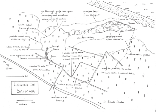 From the roundabout at the north end of Vila Nova de Santo Andre (the turn off to sites 5, 6 and 7 in Finding Birds in South Portugal - see map on page 11) follow the road south towards Sines for 6.9 km until you see a crossroads of sandy tracks (38.0151N, 8.8195W). Turn right here and follow the track to the first junction. Keep left here along a smaller track with a fenced area to your right. When the fence ends, take a track to the right then head left through a line of tall trees. Follow this sandy track into the pine wood and park (eg 38.0130N, 8,8301W) where you see a sign for the reserve. Beyond the sign is a path up through the pine forest; walk this path and keep going, keeping as close as you can to the wooded valley on your right. The lake is at the coastal end of that valley, visible from the same path.