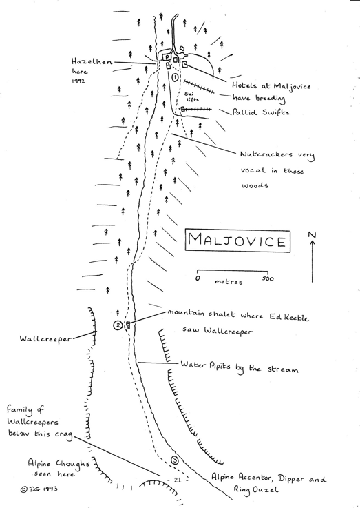 3.The higher you go, the better your chance of Alpine Accentor, Alpine Chough, Ring Ousel, Water Pipit and Dipper. In 1992 a pair of Wallcreepers were watched taking food to a site below the rounded slab of rock at the head of the valley. A few days later a male was feeding a juvenile nearby. A Honey Buzzard was the only bird of prey seen here in 3 days: the habitat seems suitable for many more. Where are the vultures?