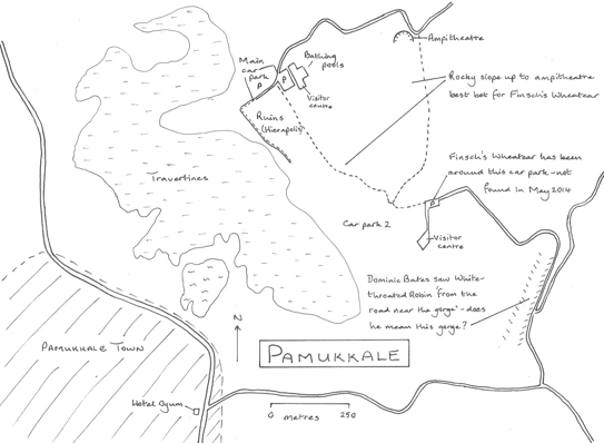 Pamukkale is a famous tourist attraction due to the spectacular crystalline rock and pool formations and the remains of a Roman spa town (Hieropolis) but it’s also a known site for Finsch’s Wheatear. Other birds reported from here have included Rock Sparrow, Rufous Bush Robin and, (by two separate observers) White-throated Robin. It was included in my book Finding Birds in Western Turkey but not in the new Finding Birds in South-west Turkey because my visit there in 2014 wasn’t very productive. However, any birder visiting this site might find the map below helpful.