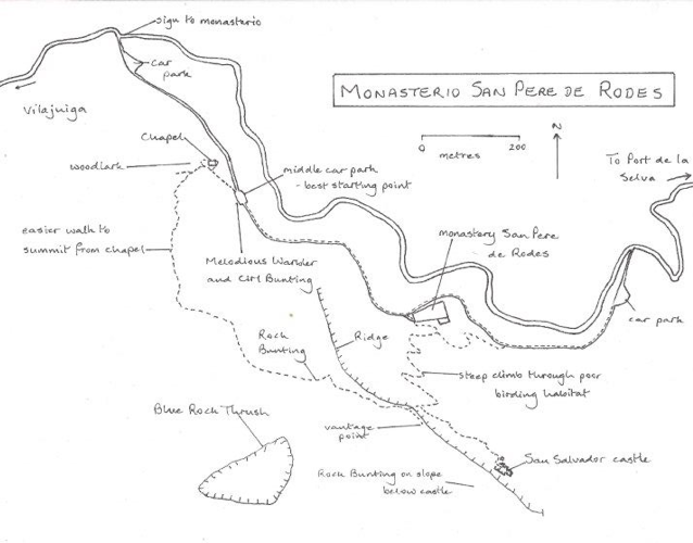 3. At the castle (42.3201N, 3.1677E) there were no further signs of either species of Rock Thrush but a Rock Bunting was singing on the rocky slope below. The warblers within earshot were again only Sardinian, Melodious and Blackcap plus distant Orpheans.