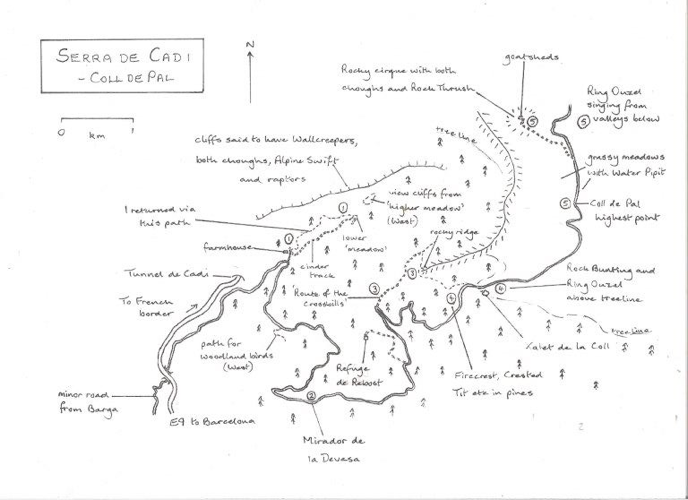1. Steve West recommends a walk from a large stone farmhouse on the left, after passing the km 6 marker. He describes walking up beside a stream to some meadows after 1.5 km with birds such as Tree Pipit, Red-backed Shrike and 3 buntings, Rock, Cirl and Ortolan. From there you can apparently scan some cliffs for ‘Lammergeier, Griffon Vulture, Golden Eagle, Peregrine, Red-billed Chough, Alpine Chough, Alpine Swift, Crag Martin and even Wallcreeper.’ I parked by the road (42.2971, 1.8715E), walked up to the farmhouse then doubled back a little to find a cinder track which ran parallel with the stream. There were Grey Wagtails on the stream but the woodland had mostly common UK species apart from Bonelli’s Warbler and Firecrest. After 1.1 km, just before the track bent right, there was an open area on the left (42.3029N, 1.8831E), more a grassy patch than a meadow. I turned left into this open area and tried to find a path to a bigger meadow but the only path I found took me back to the farmhouse at a higher level than before, through scrubbier habitat. Birds here included Stonechat, Dunnock, Firecrest, Crested Tit, more Bonelli’s Warblers and a Subalpine Warbler. A bunting called but I couldn’t tell whether it was Rock or Cirl. I didn’t find anywhere to scan across to the cliffs and the persistent mists meant there was little chance of seeing raptors. Even so, I would have heard choughs if they’d been anywhere near and Black Woodpeckers if they’d called. Looking on historical images on Google Earth it looks like I should have aimed for the right-hand corner of the first ‘meadow’ and scrambled upwards to a higher ‘meadow’ but the vegetation has now grown so there was no obvious way of doing that. Hence I missed out on the cliff species, the shrikes, pipits and most of the buntings – some of which may have gone as the habitat seems to have changed.