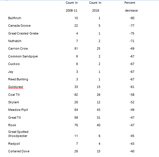Species with lower numbers counted in 2016