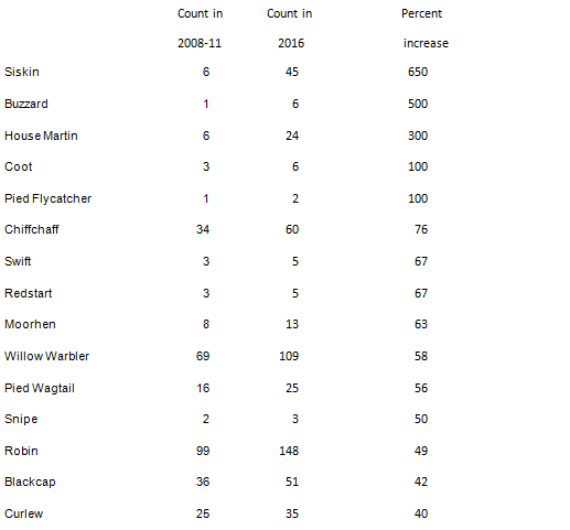 The figures for Coot, Pied Flycatcher, Swift, Redstart and Snipe are all based on a very small sample size and the 2016 count for House Martin is greatly boosted by one flock of 15 birds which has distorted the picture but the other species could well have increased since 2008-10 or at least been particularly numerous in 2016.