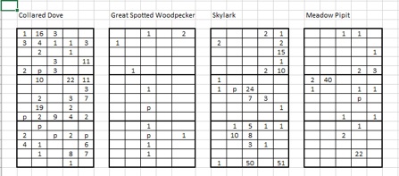 This paper shows the results of 1-hour counts in winter in every tetrad in these three 10km squares down the east side of Sheffield and compares them with previous studies. Here are maps for a few of the species (sorry, the boundaries of the 10km squares have been lost in the formatting here): note that Collared Dove is far from ubiquitous and the other three species were missing from large parts of the area. Note also the importance of a few ‘hotspots’ for Skylark.