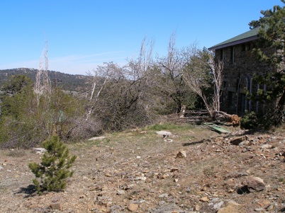 The pool is on the lip of this open area between the fallen door and the bare pine tree