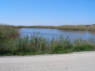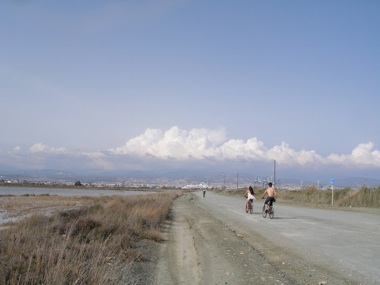 The road behind Ladies Mile Beach takes you along the eastern edge of Akrotiri salt lake, passing roadside pools that can be terrific for waders. Limassol is in the background. Behind the cyclists are the cranes of the port area next to Zakaki pool.